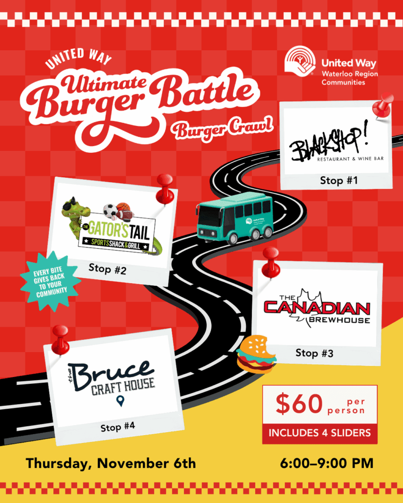 Join us on Thursday, November 6th (6–9 PM) for the Ultimate Burger Battle Burger Crawl — a four-stop slider adventure through some of Waterloo Region’s best restaurants! Participants will sample signature burgers competing for the title of Top Ultimate Burger Champion, enjoy an unforgettable night of flavour and fun, and make a lasting impact right here at home through United Way Waterloo Region.