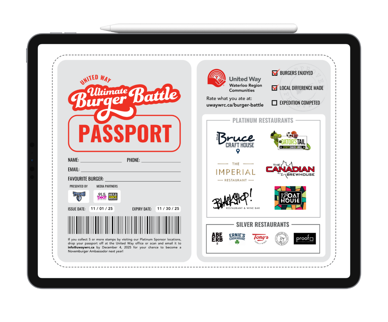 Journey through the flavours of Waterloo Region with your Ultimate Burger Battle Passport! Log five or more Platinum-level Ultimate Burgers for your chance to become an ambassador for next year’s Ultimate Burger Battle! Be sure to submit your passport by emailing a photo of it to info@uwaywrc.ca by December 1st to enter.