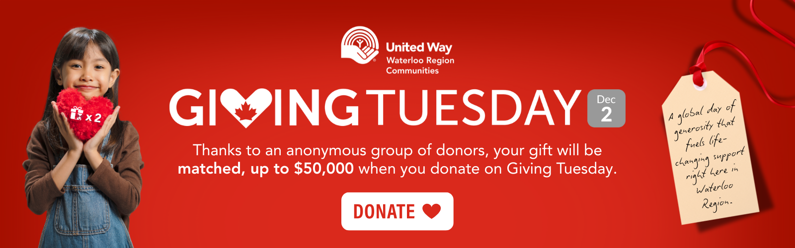 Giving Tuesday is a global day of generosity and compassion, mobilizing communities to give back locally at the start of the holiday season. A powerful day of collective giving, every act of generosity is amplified when you donate, share the message and invite others to join in. It’s about giving back to the community you live, work or study in.